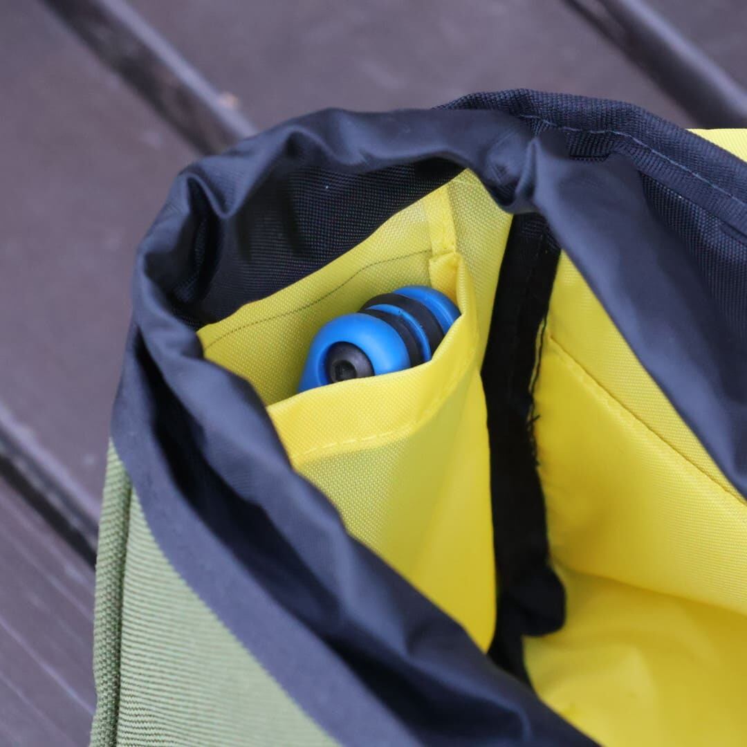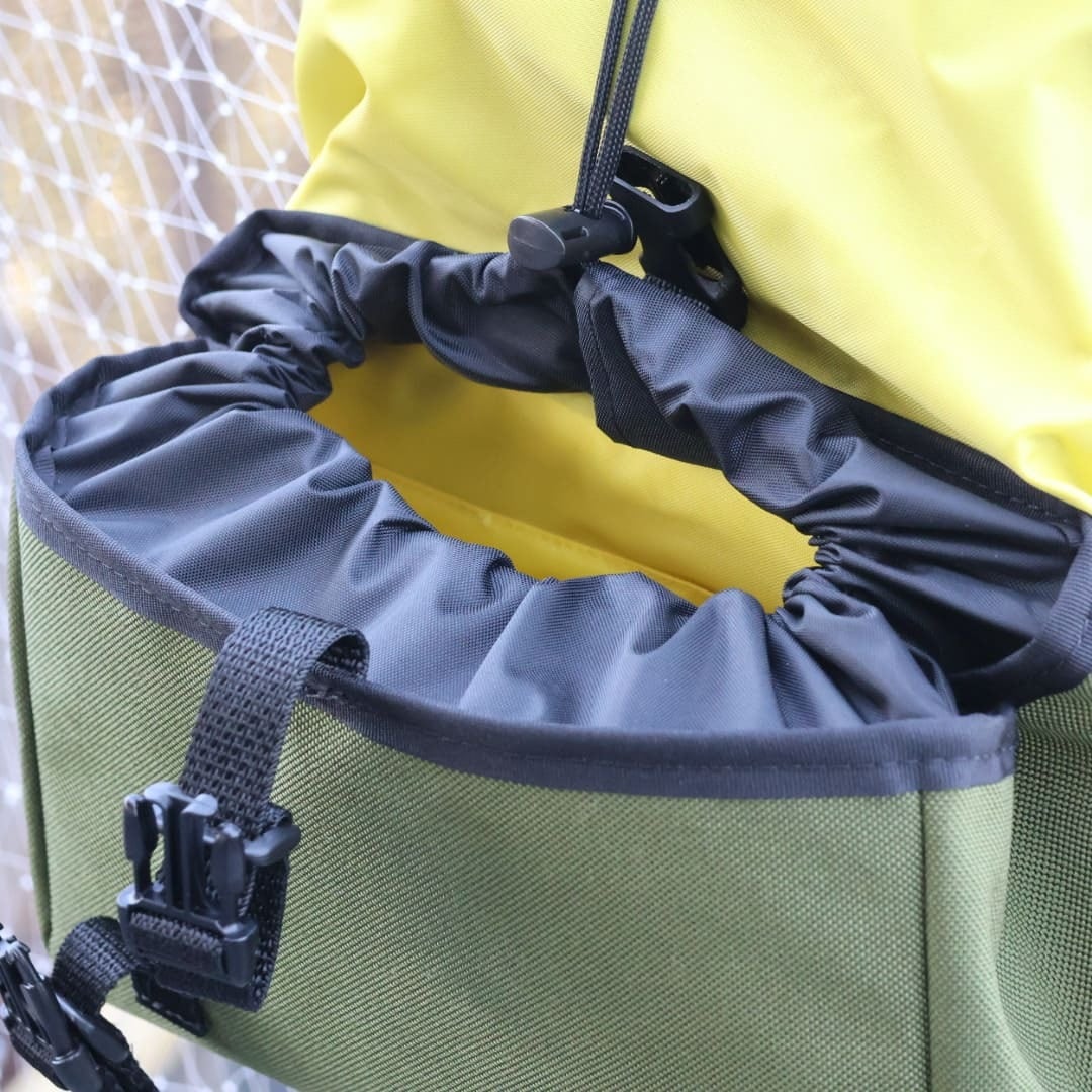 巾着式の開口部は、荷物の飛び出しを防ぎつつ、出し入れもスムーズ。小さな内ポケット付きで、細かな整理にも対応します。
