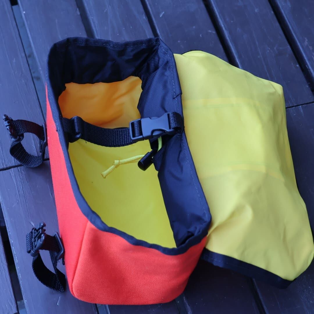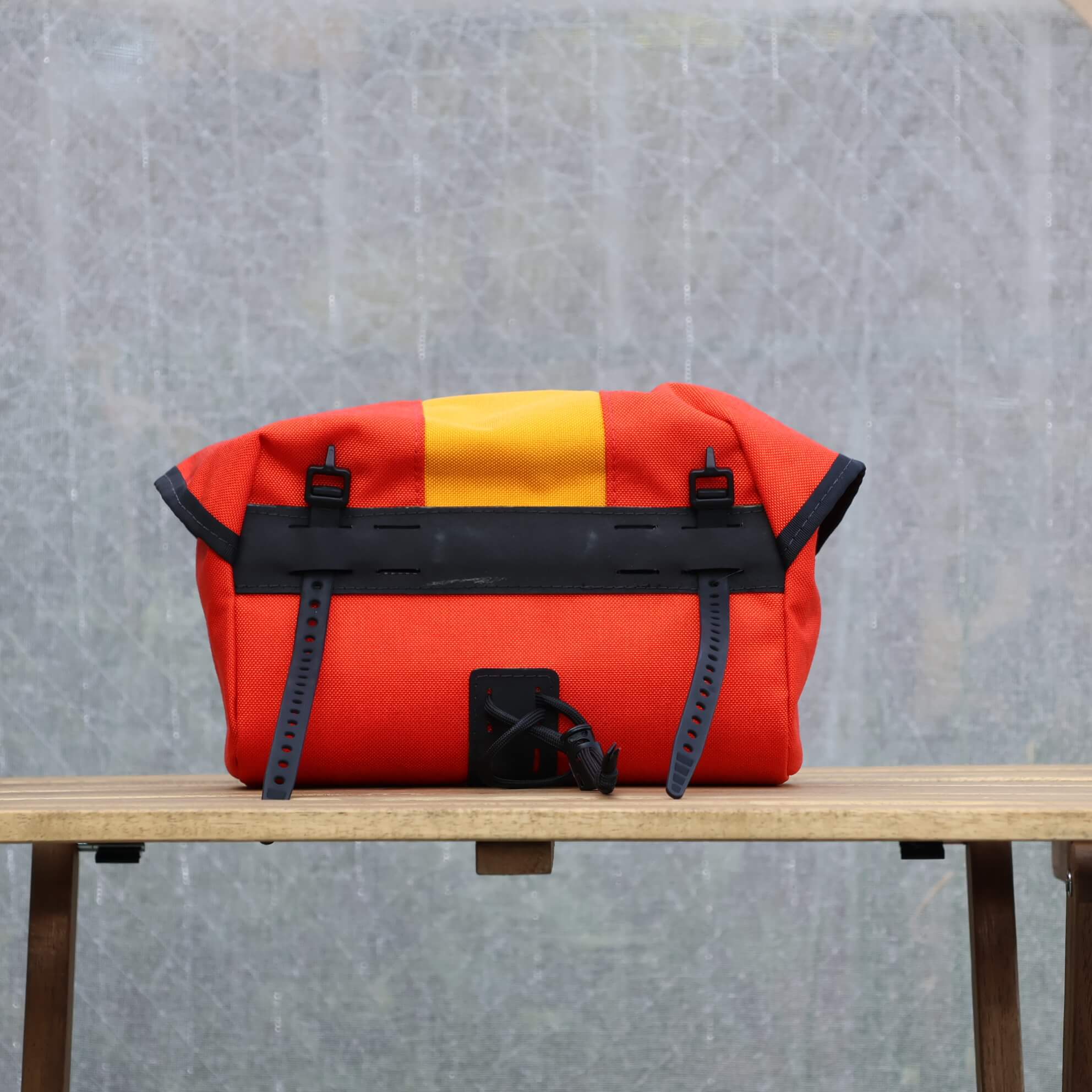 小さく折りたためるMusetteバッグが付属しており、ちょっとした買い物や、ライド中に自転車から離れるときの貴重品入れとしても便利です。もちろんこのバッグもハンドメイド。