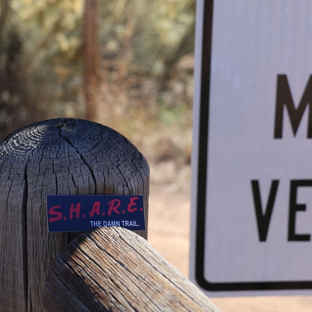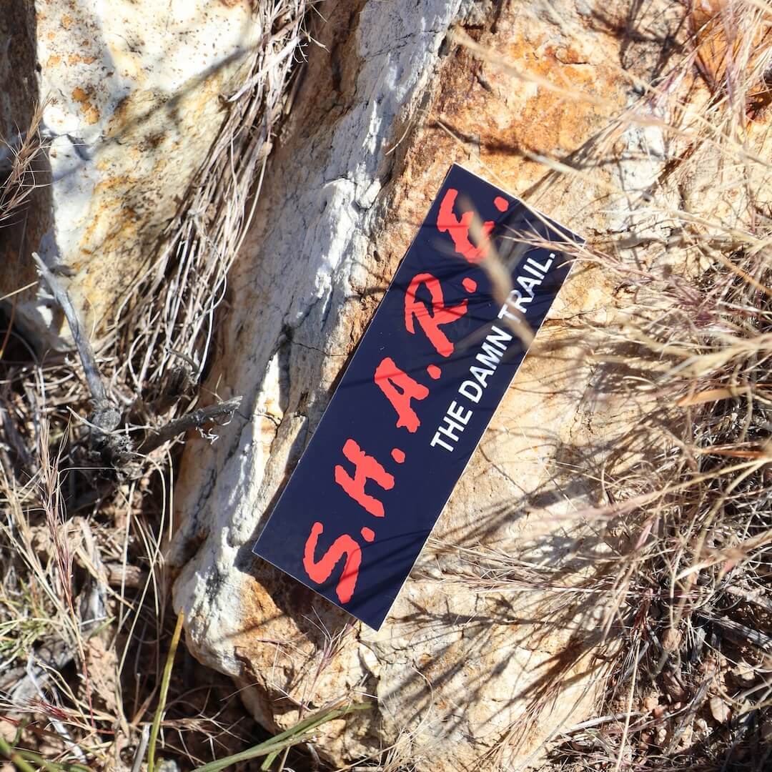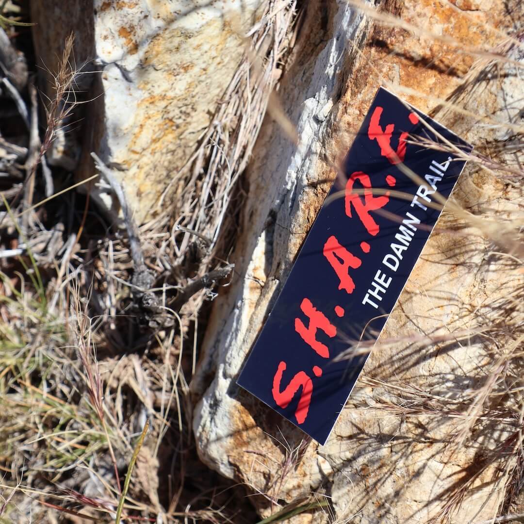 今回のステッカーは、そんな「90年代アメリカの公共キャンペーン文化」をユーモアとして再構築したようなオマージュ。D.A.R.E.が当時の子どもたちにとって“半ばファッション化した正義のアイコン”だったことを踏まえ、「S.H.A.R.E.(共有しよう)」に置き換えてトレイル文化へ転用している点が、なんとも皮肉で、そして実にSend It Safelyらしい一品です。