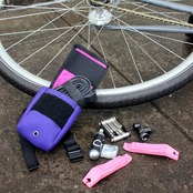 内側が鮮やかなピンクのライニングになっていて、中身が見やすい。また幅約5cmのベルクロでしっかり閉じられる。この2点で、パンク修理も快適に。