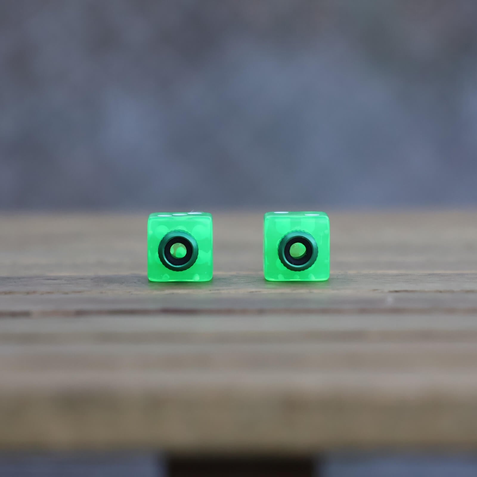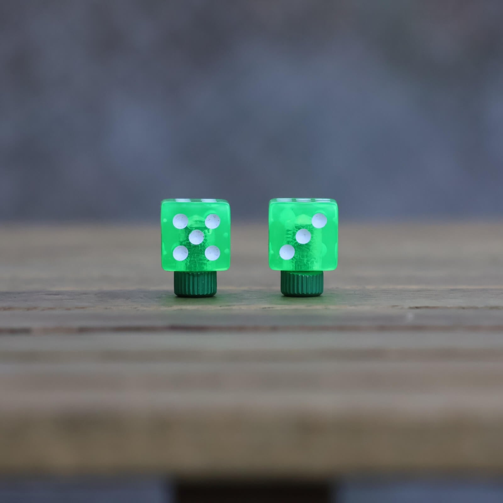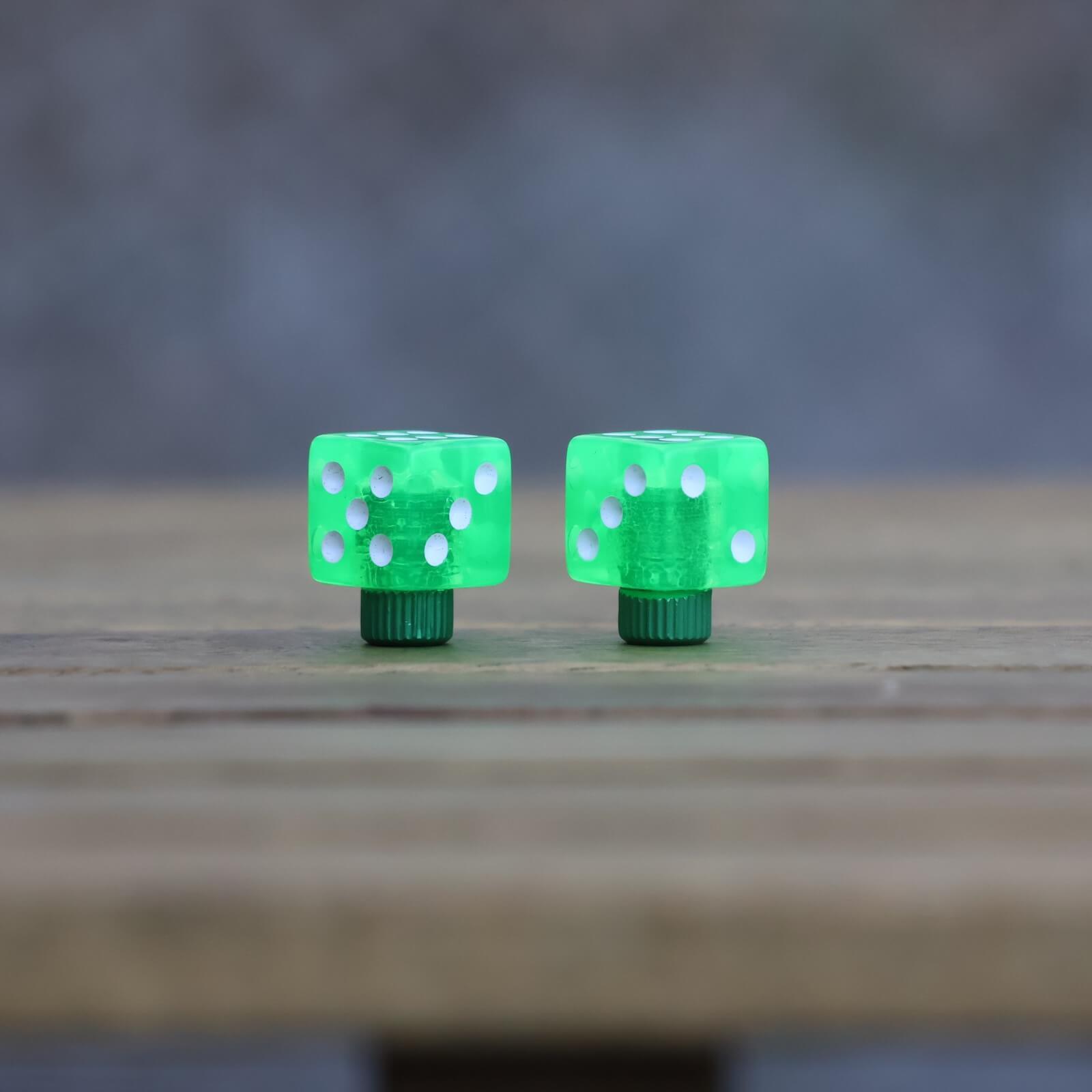3Dプリンターで作られたダイス型のバルブキャップで、表面にはどこか手触り感が。2個セットのため、1個ずつ分けてお友達とシェアも楽しいかも。