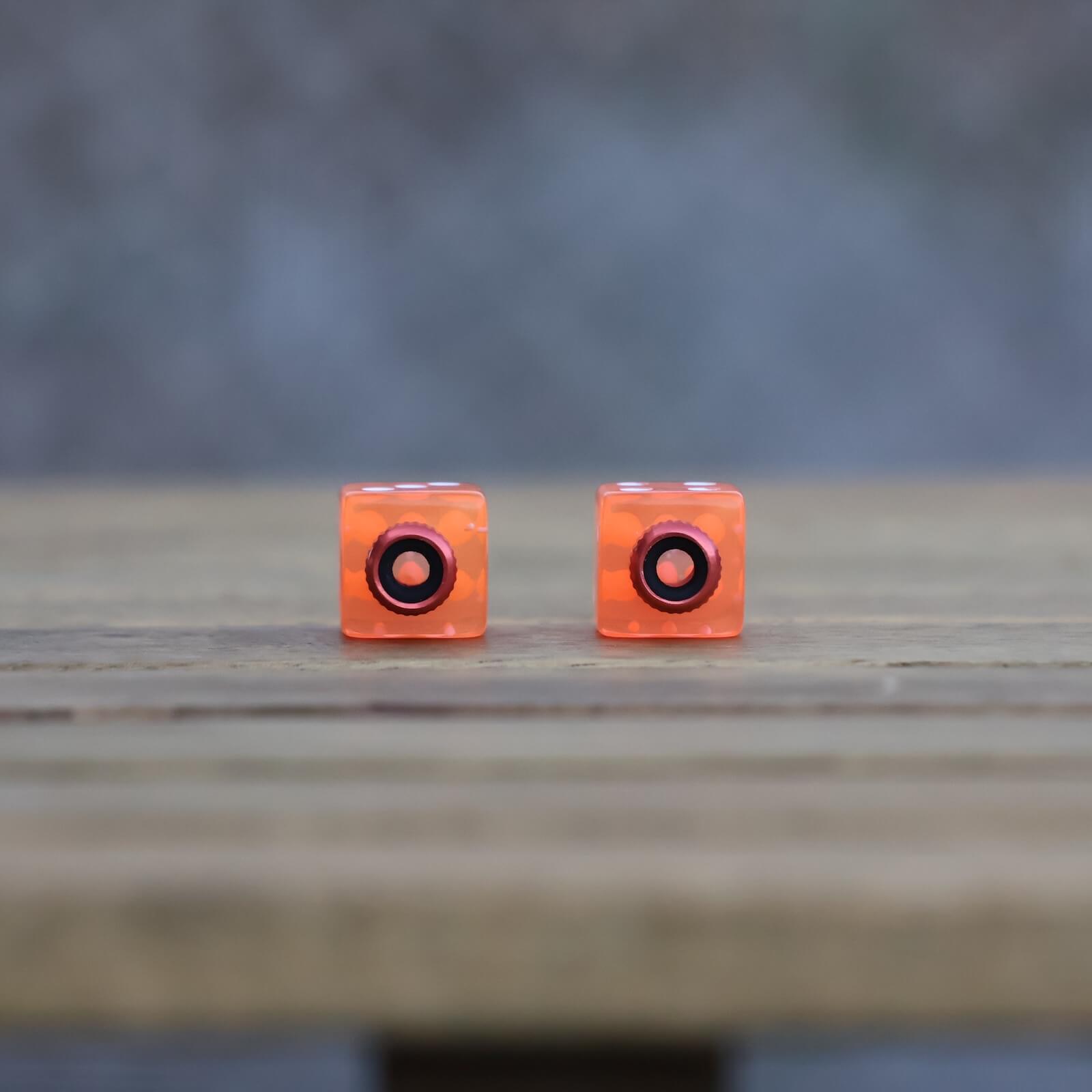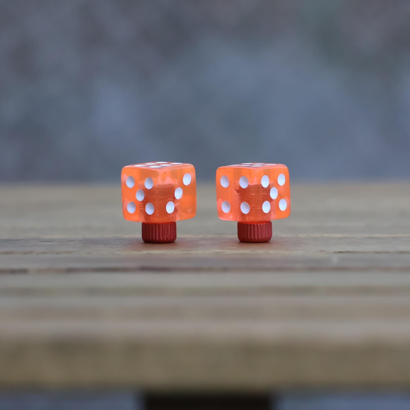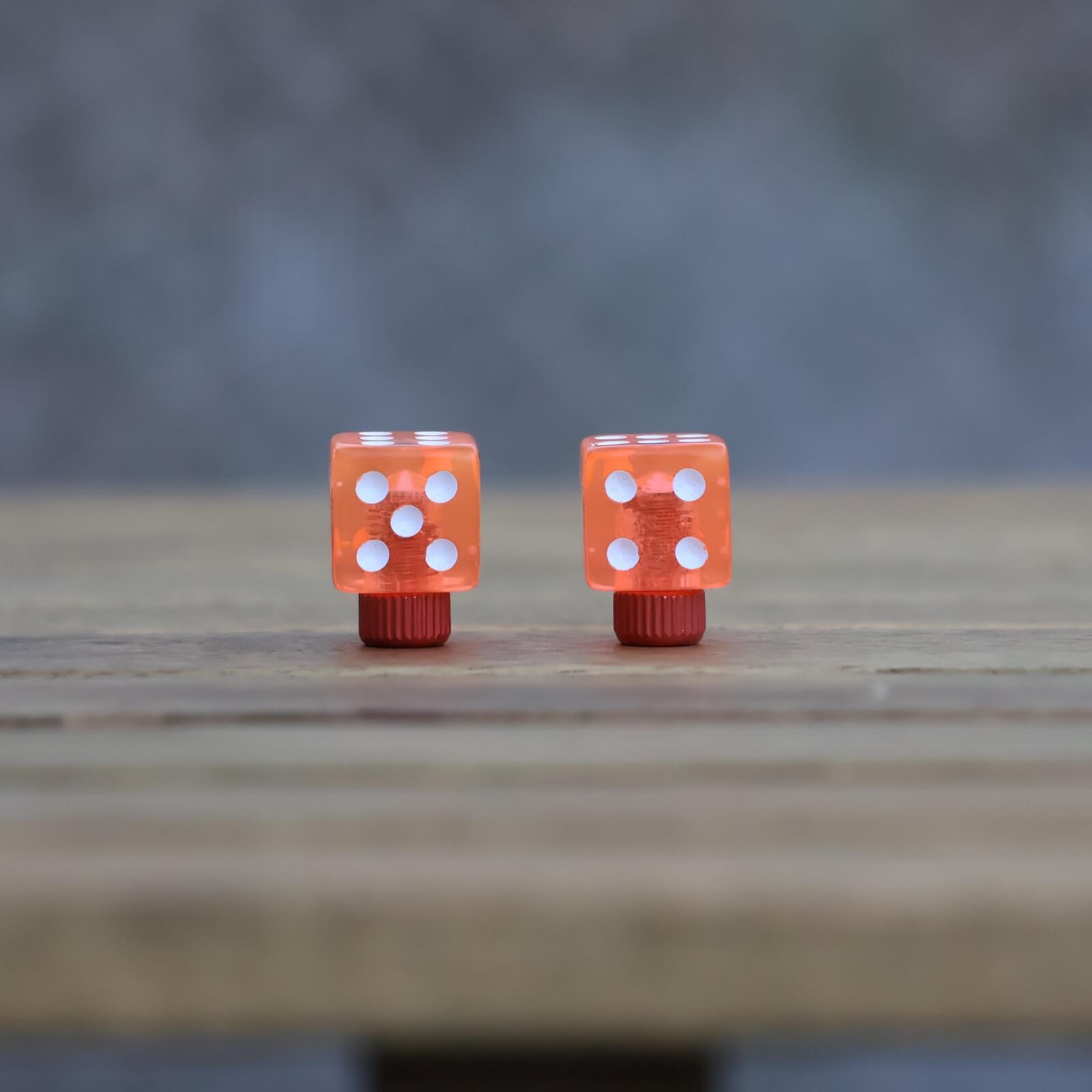 3Dプリンターで作られたダイス型のバルブキャップで、表面にはどこか手触り感が。2個セットのため、1個ずつ分けてお友達とシェアも楽しいかも。