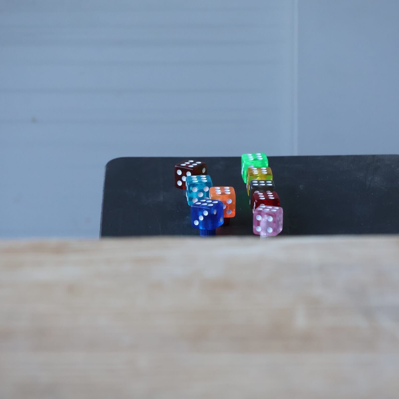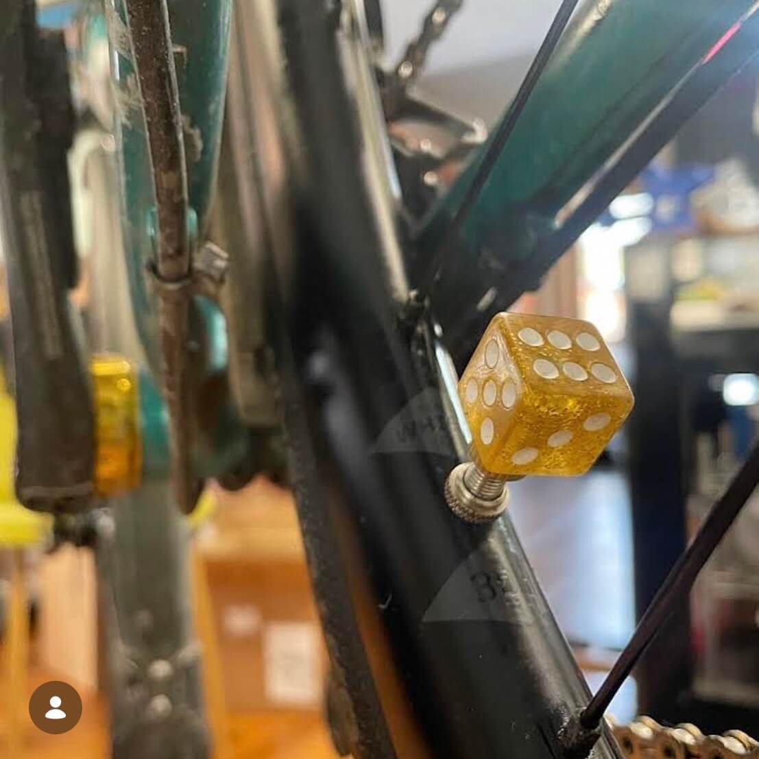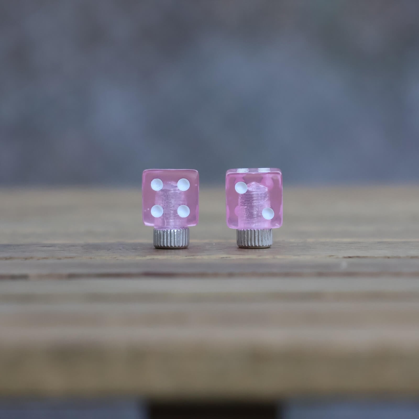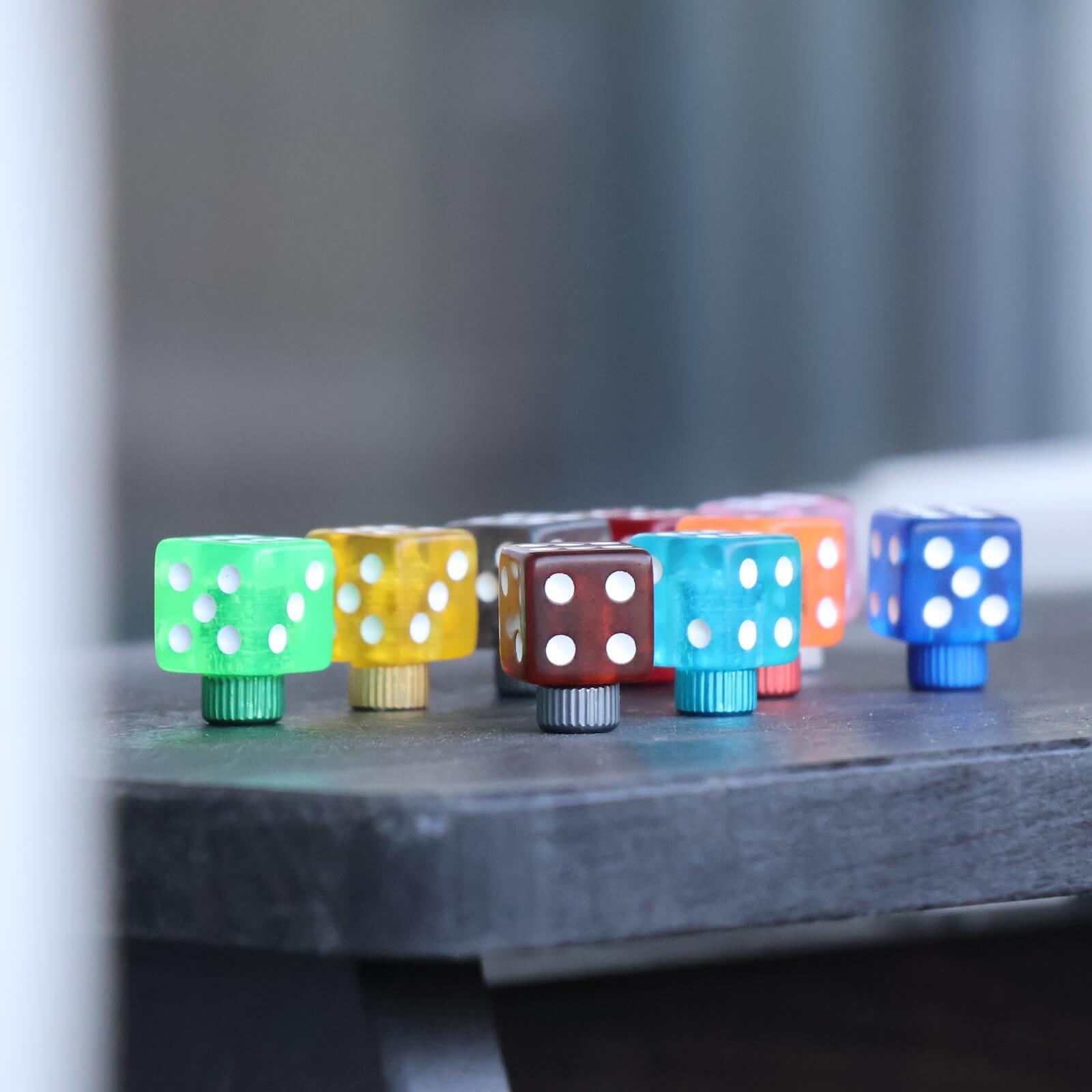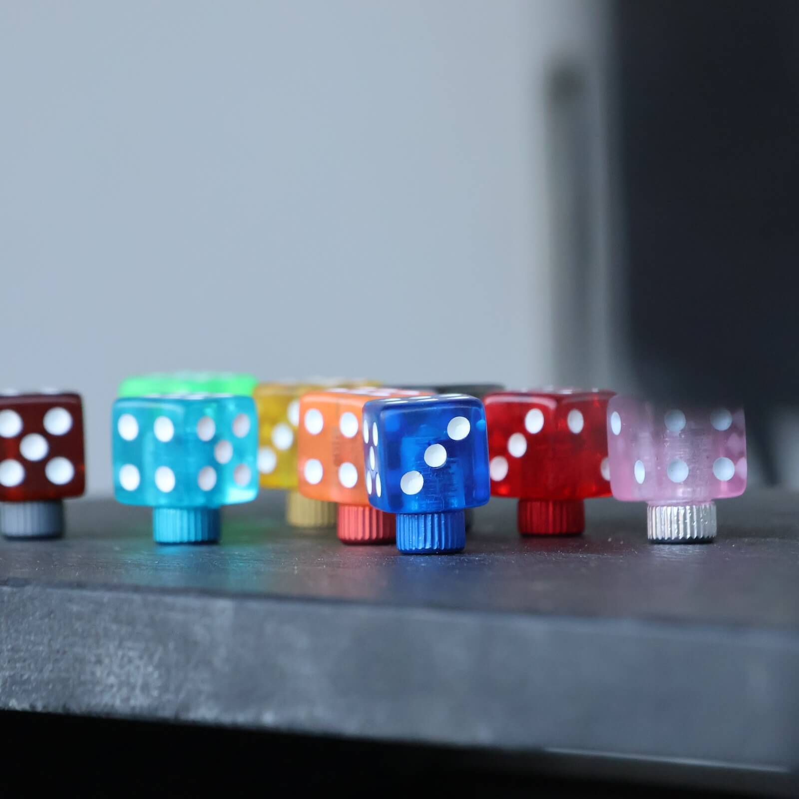3Dプリンターで作られたダイス型のバルブキャップで、表面にはどこか手触り感が。2個セットのため、1個ずつ分けてお友達とシェアも楽しいかも。