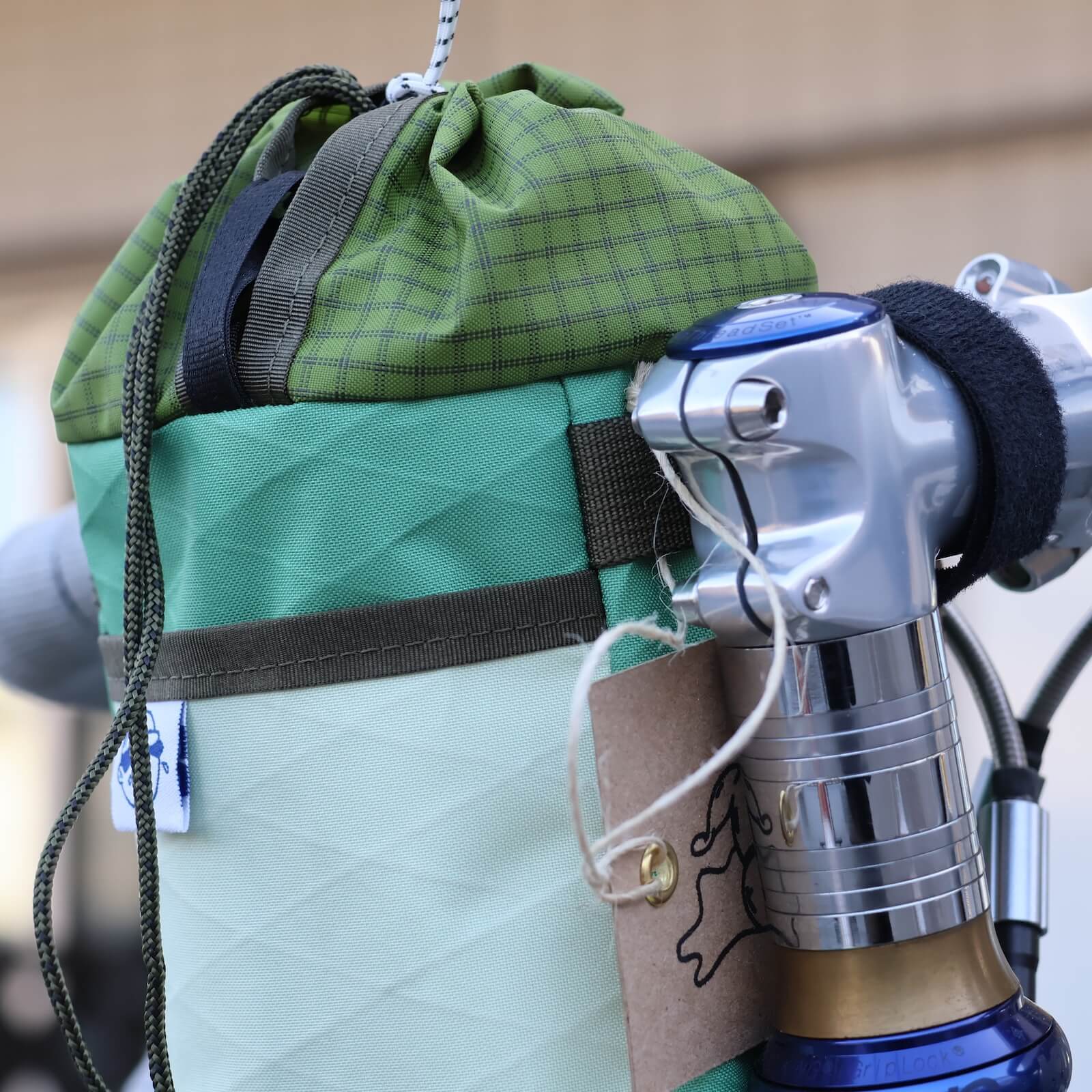 Chunky Boi Snackbagは、現代的なステムバッグに求められる要素をひと通り備えています。形をキープするEVAフォーム入り。片手で開閉可能。左右どちらにもつけられるユニバーサル仕様。ちょっとしたものを入れられるフロントポケット。1リットルのナルゲンが入るサイズ。底には水抜き用のハトメ穴。