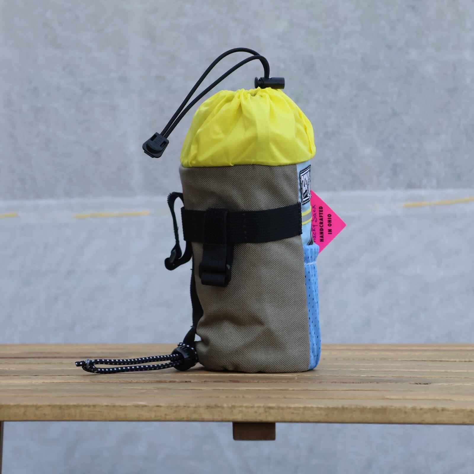 Snacky Sacksはフロントポケット付きのステムバッグです。ナルゲン1リットルが入るサイズ感。ヴィンテージ生地を組み合わせながら、このバランスに仕上げているのはさすが。ロゴの入る前面には、アクセントとなる生地が使われています。