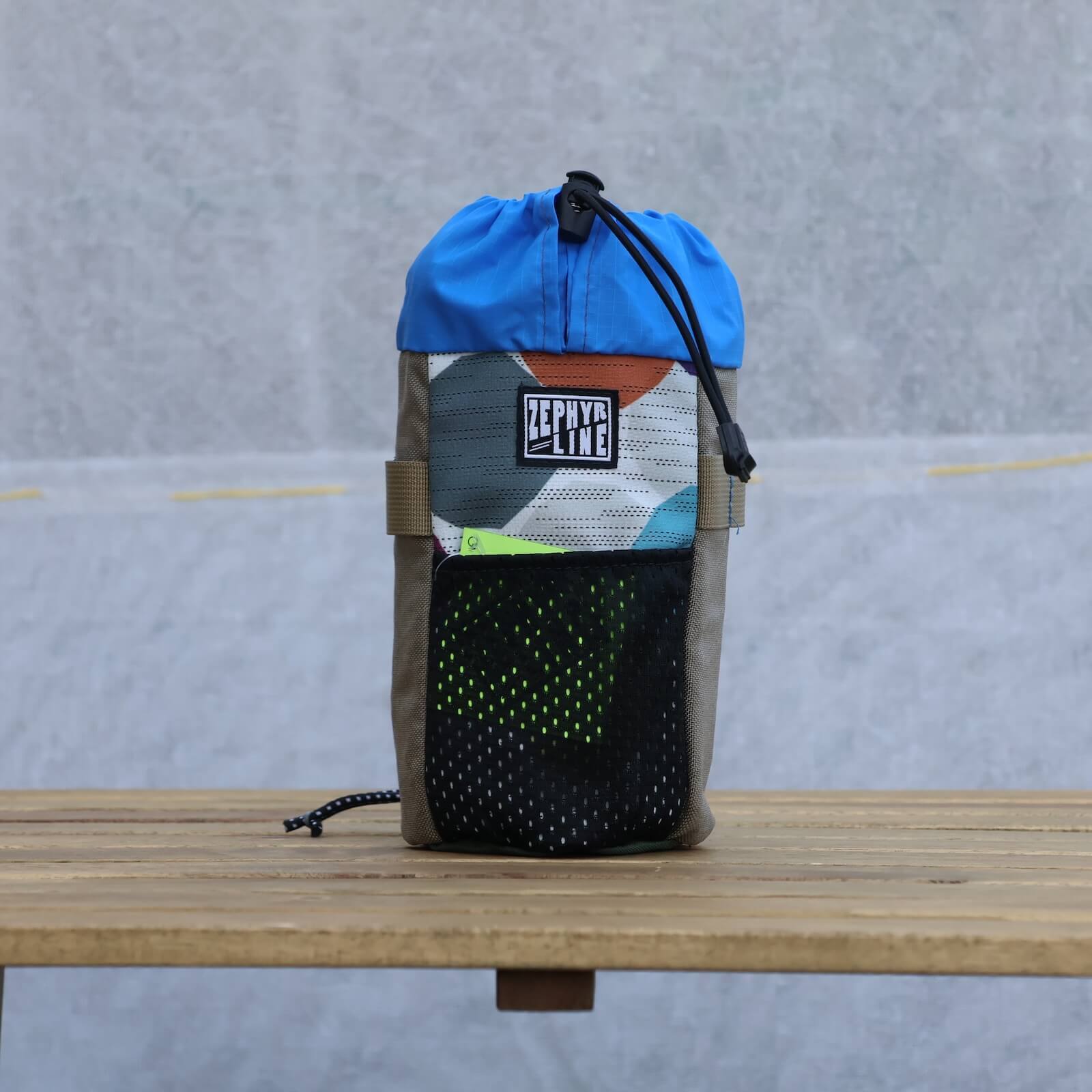 Snacky Sacksはフロントポケット付きのステムバッグです。ナルゲン1リットルが入るサイズ感。ヴィンテージ生地を組み合わせながら、このバランスに仕上げているのはさすが。ロゴの入る前面には、アクセントとなる生地が使われています。