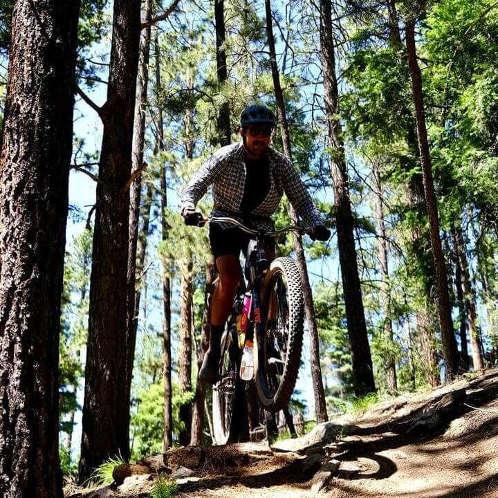 下部のイラストは、パンクスが炎の中を走るビジュアル。少しポストアポカリプス的で、荒っぽさと遊びが混ざっています。ハイテクな機械文明ではなく、ローテクな自転車で進むという対比も効いています。
