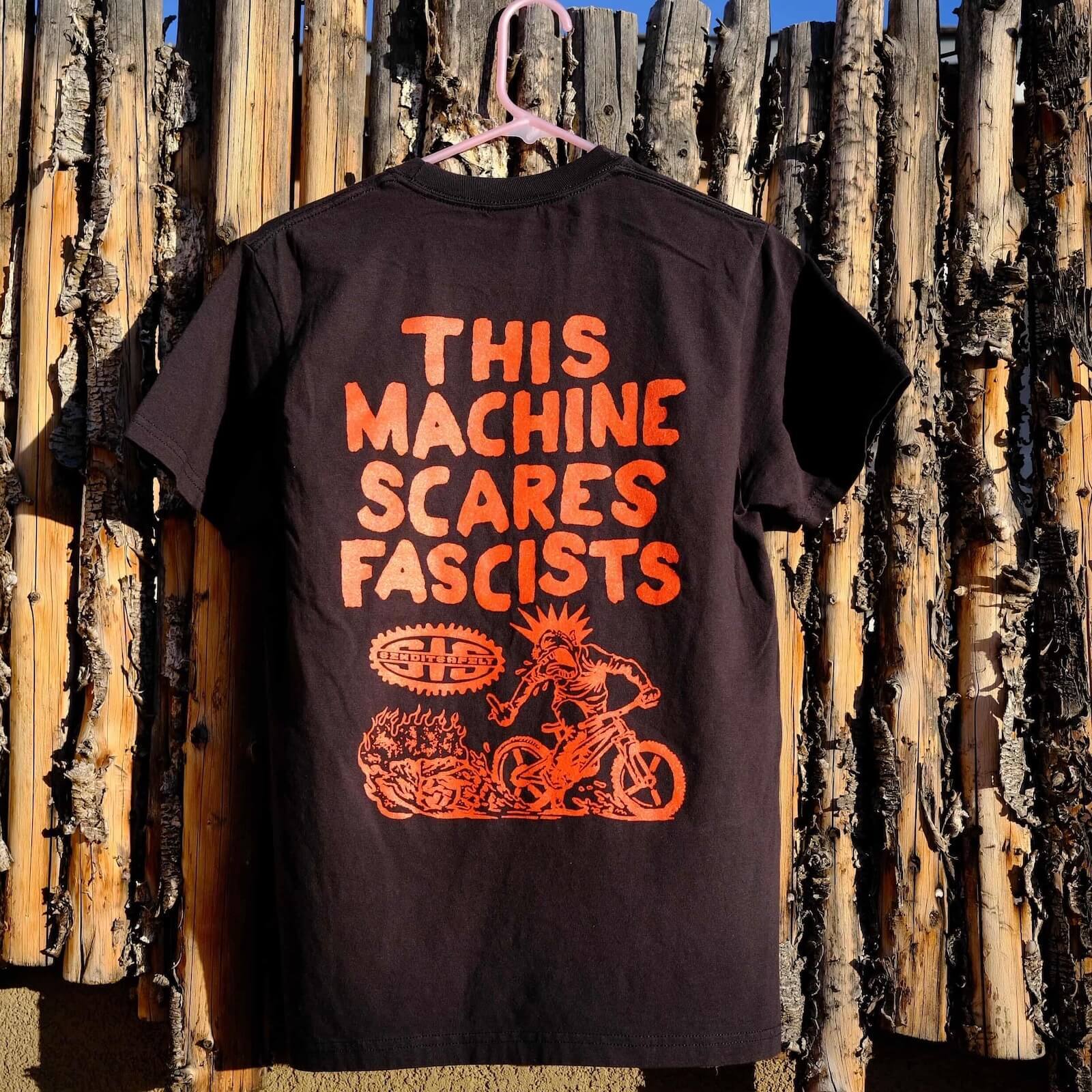 Tシャツの核になっている「THIS MACHINE SCARES FASCISTS」というフレーズ。元ネタは1940年代、アメリカのフォークシンガーであるウディ・ガスリーが、自分のギターに貼っていた「This machine kills fascists(この機械はファシストを殺す)」という言葉です。