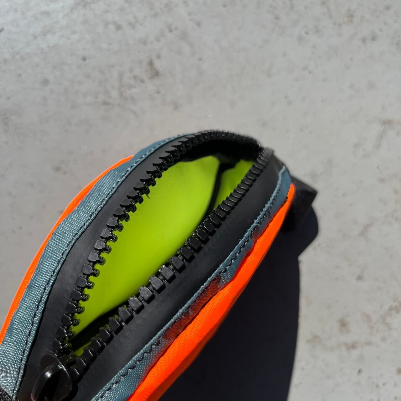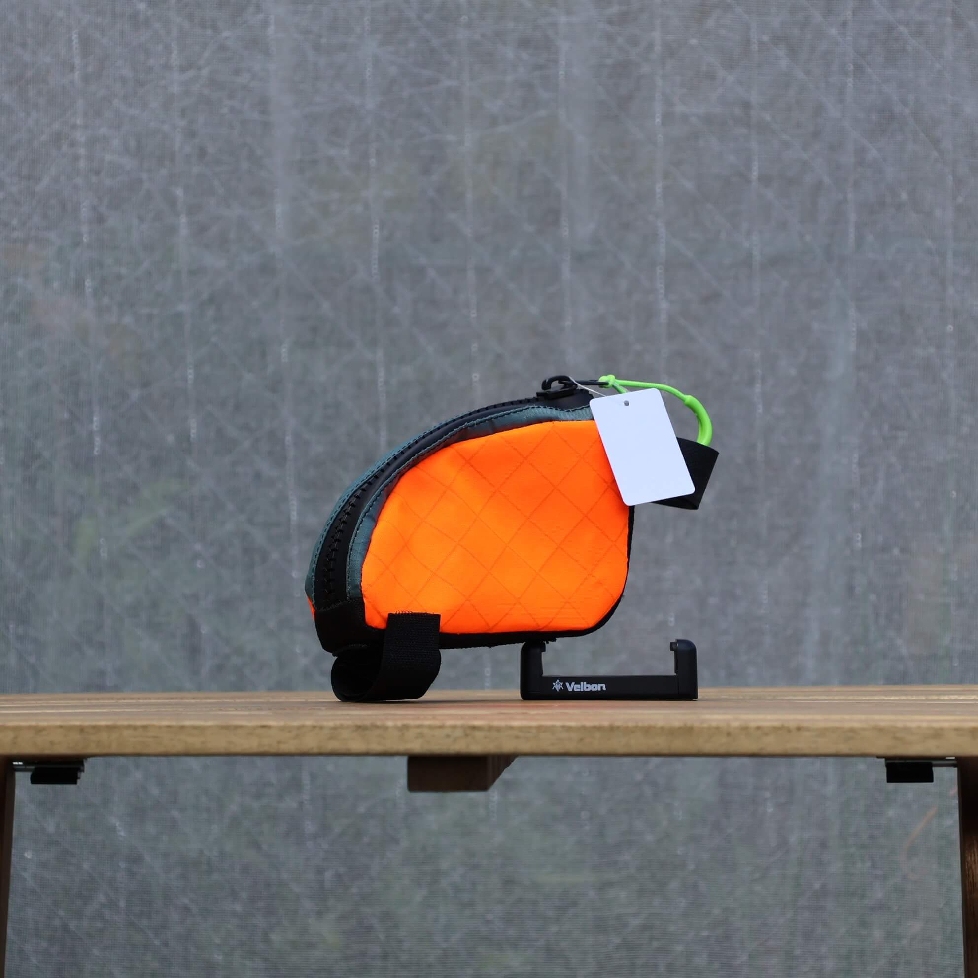 取り付けは簡単で、シートポストとフレームにベルクロ2本で固定。接触部分にはウェビングテープが施され、安定した取り付けができます。止水ジッパーとZipper Garageにより小雨程度なら問題なく、幅広のトラクタージッパーとカラフルな引き手はグローブをしたままでも扱いやすい仕様です。内装のネオングリーンは中身をひと目で確認でき、細部まで気の利いた設計が光ります。