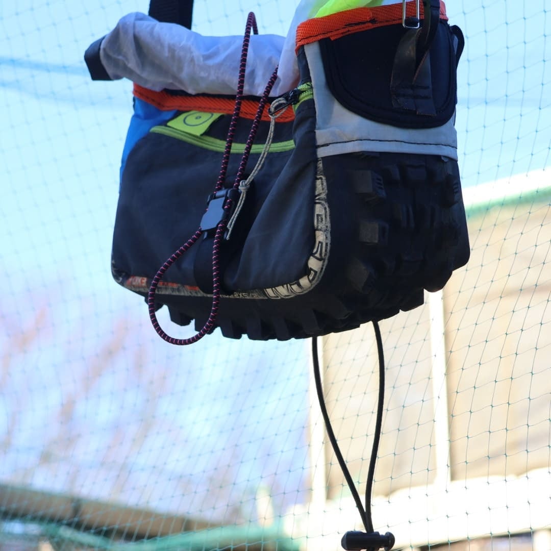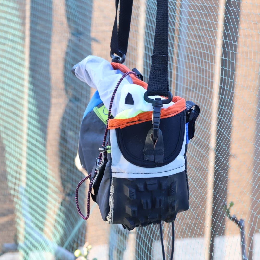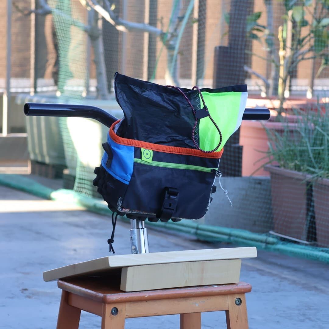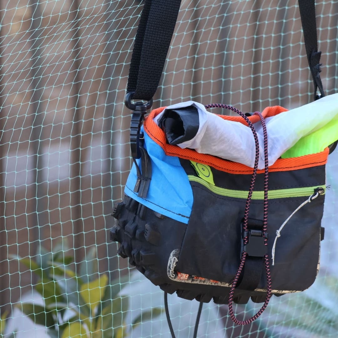 THE SALTY BOOBは、オレゴン州ベンドを拠点とするアップサイクルブランドで、カイトサーフィンの帆や広告バナー、自転車の廃タイヤなど、土地で役目を終えた素材を組み合わせながら一点ずつ手作業で仕立てています。「生地を新しく購入して」作るのではないため、同じデザインはふたつとありません。今回の「Wrap Mini」は、蓋の役割をするロールトップ付きで、Fidlock製マグネットを採用し、片手で留められる扱いやすさが魅力です。小ぶりなサイズ感でハンドルまわりに収まりがよく、取り外し可能なショルダーストラップを使えばライド後もそのまま持ち歩けます。気負わず使えて、どこかに個性がにじむ——そんなTHE SALTY BOOBらしさが自然に表れたアイテムです。
